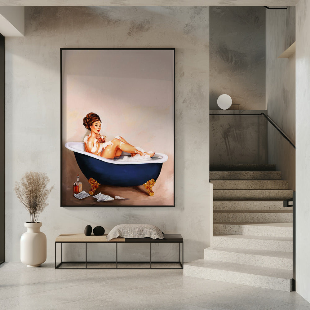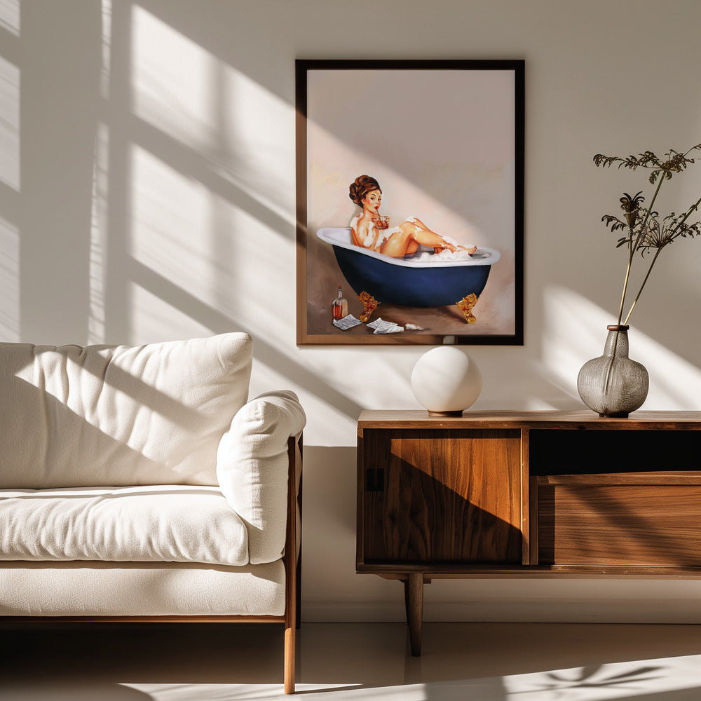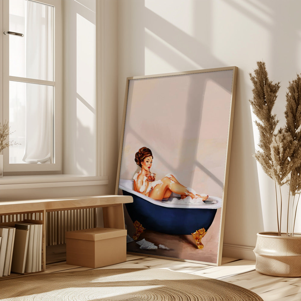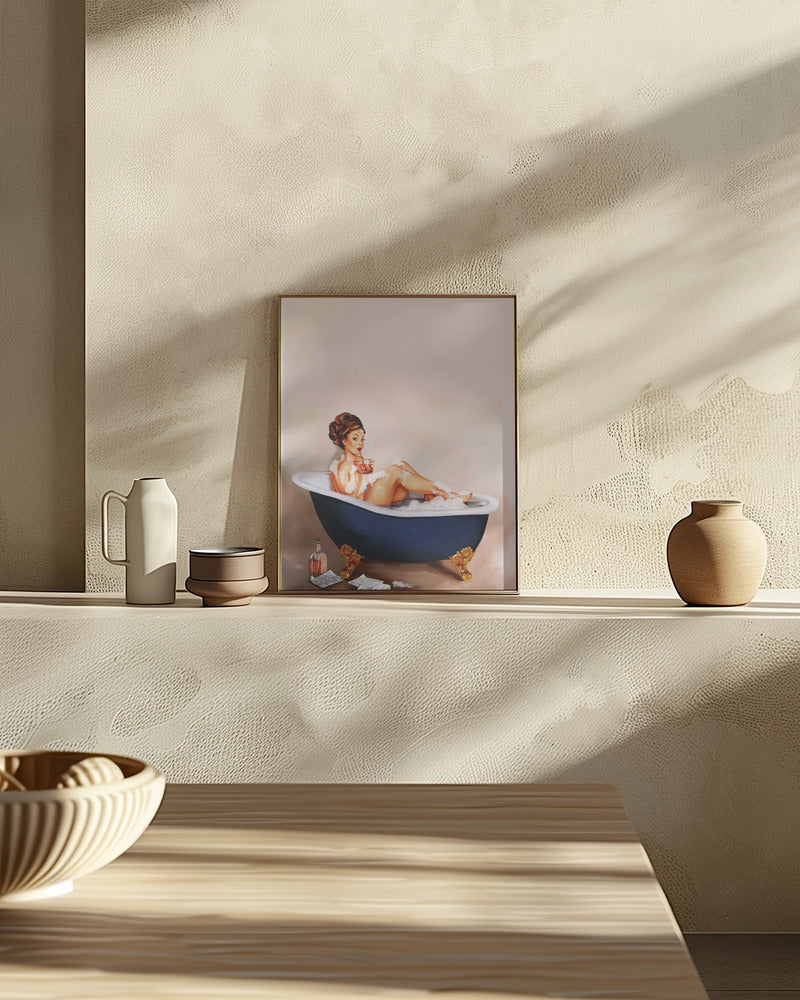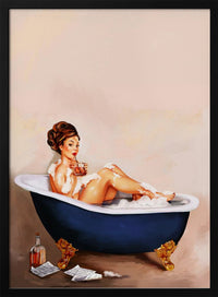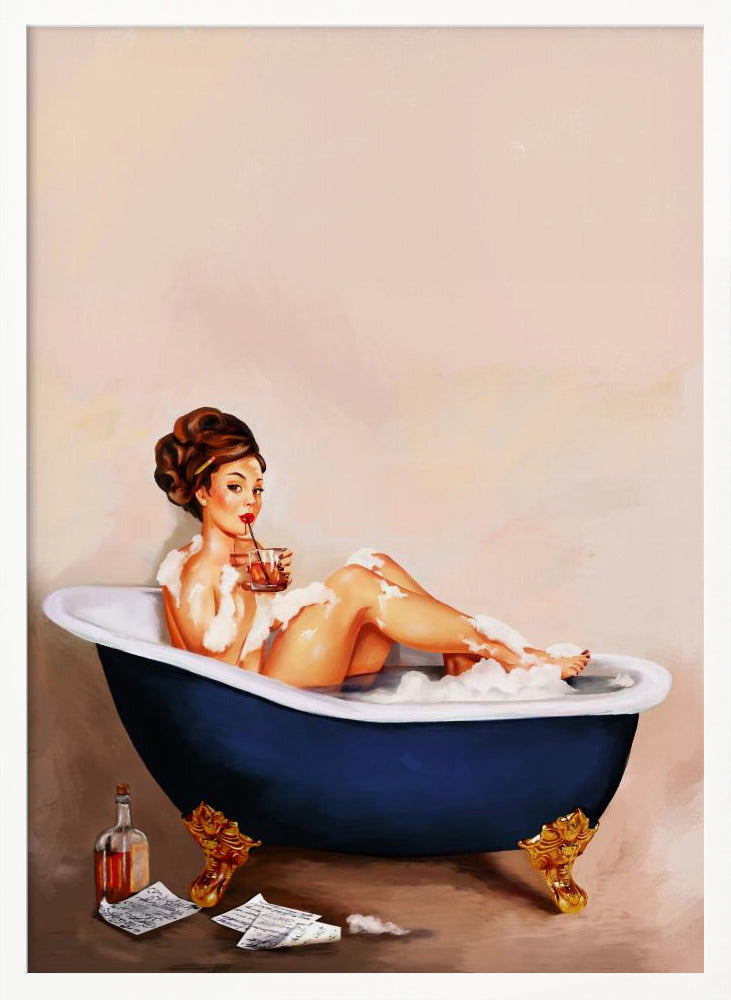Bathtub Drinks: Pinup Girl Drinking In Bathroom Poster - 30x40 cm / 12x16″