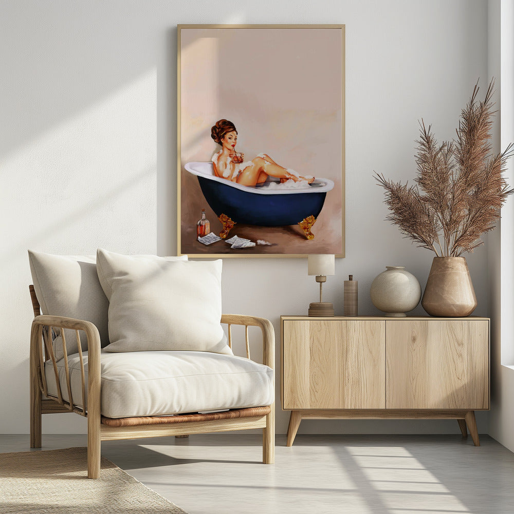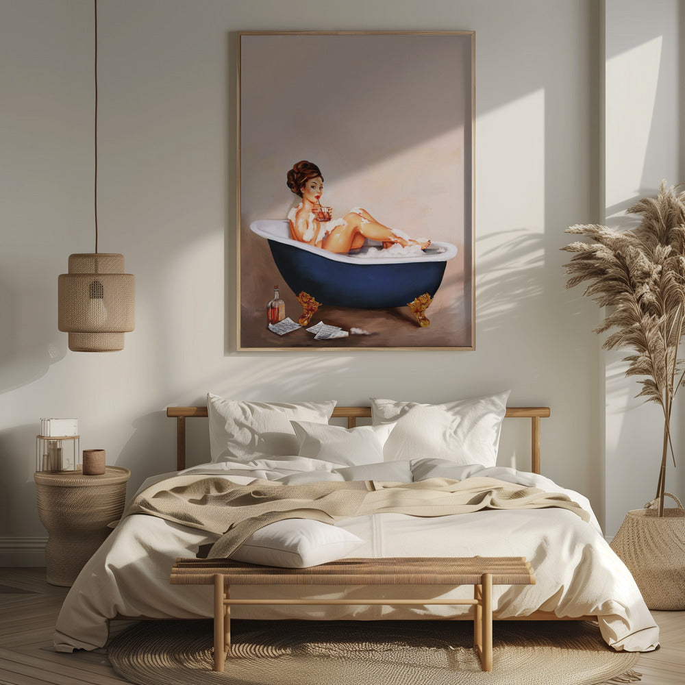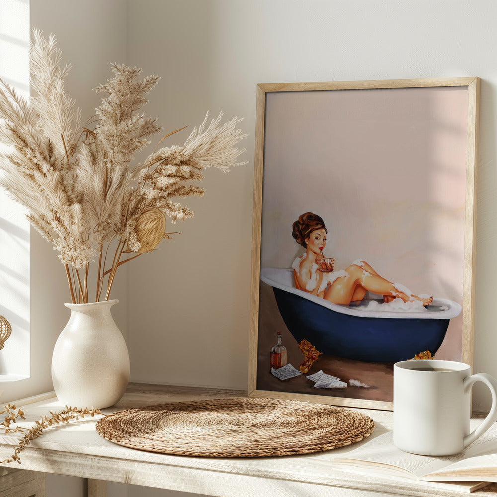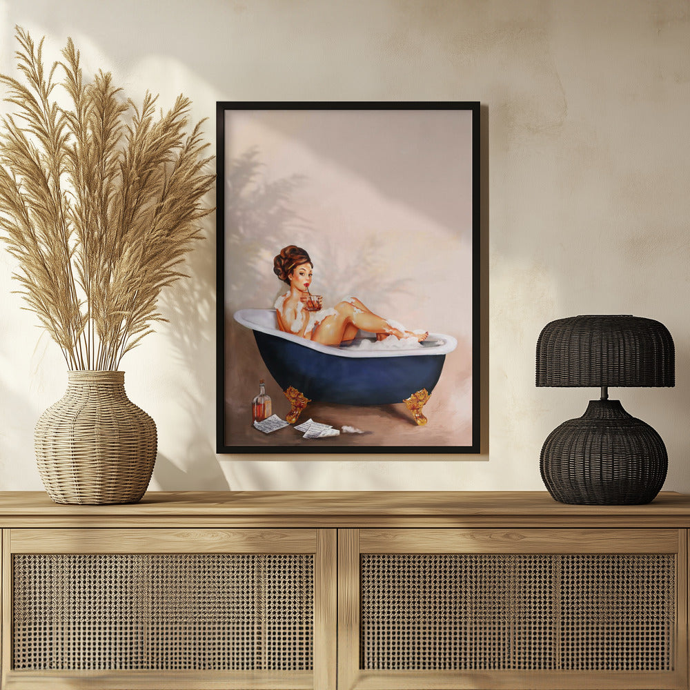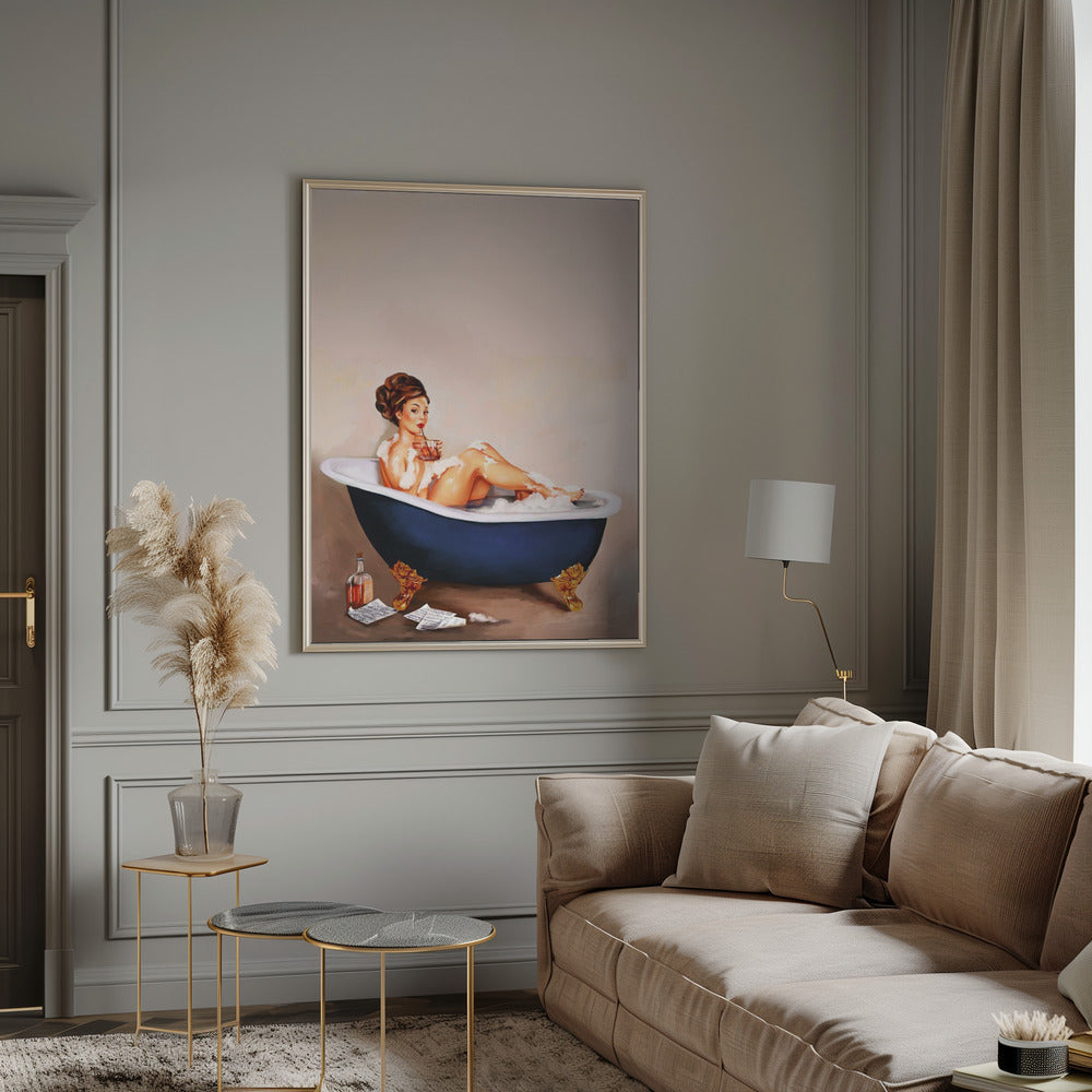 Bathtub Drinks: Pinup Girl Drinking In Bathroom Poster - 30x40 cm / 12x16″