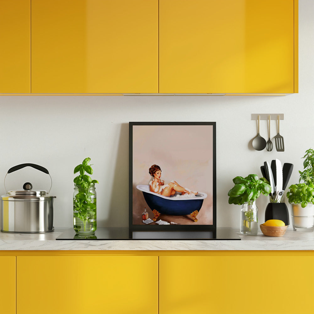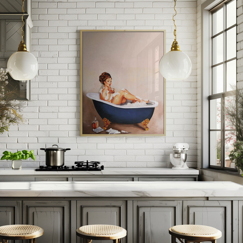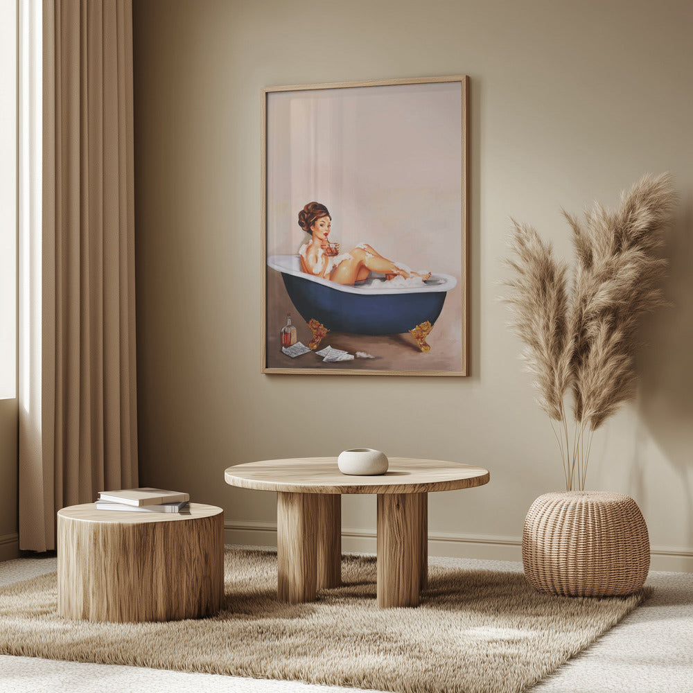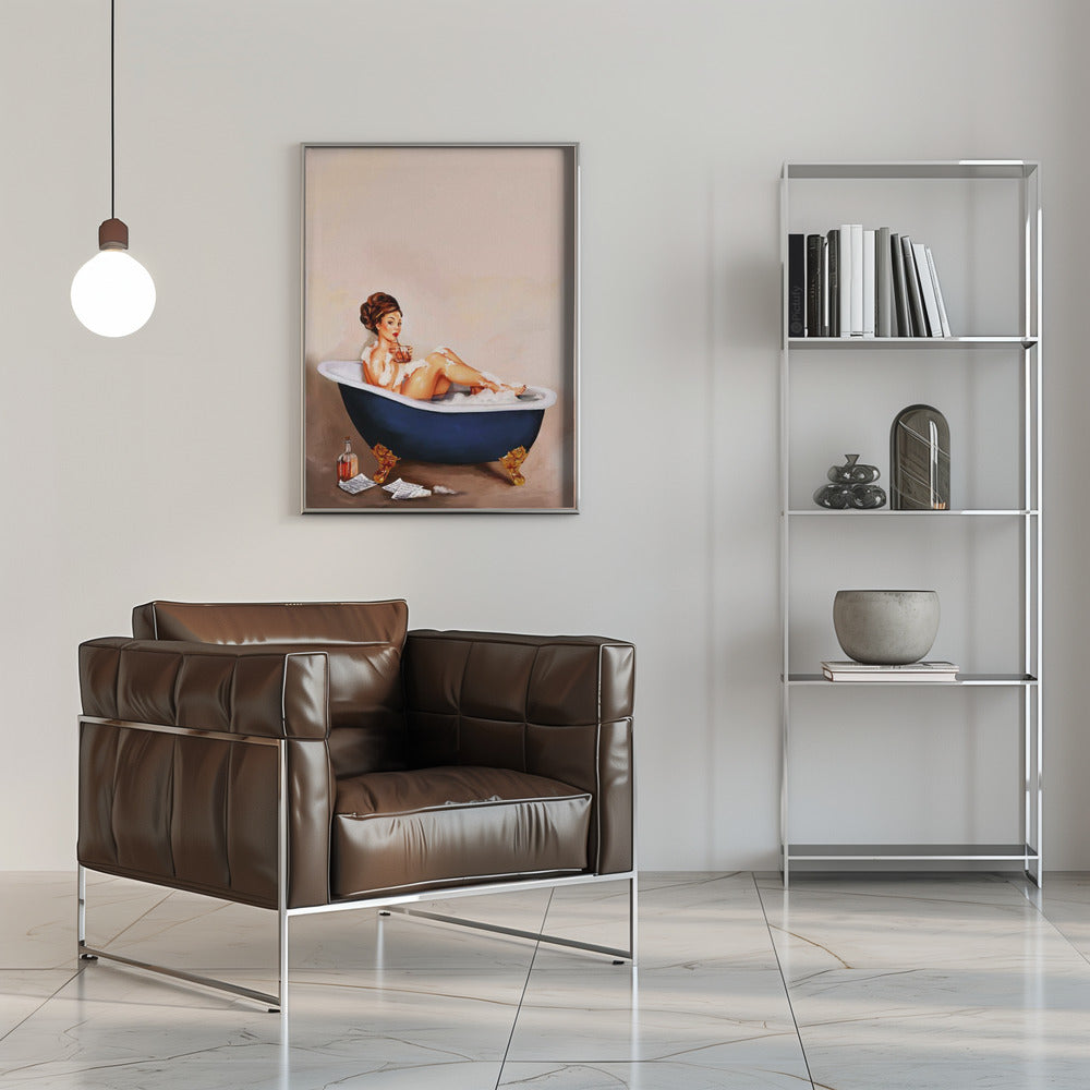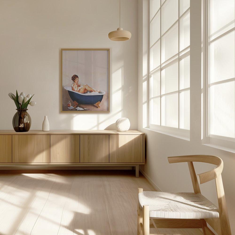 Bathtub Drinks: Pinup Girl Drinking In Bathroom Poster - 30x40 cm / 12x16″