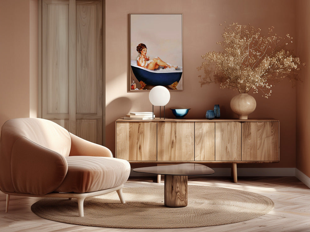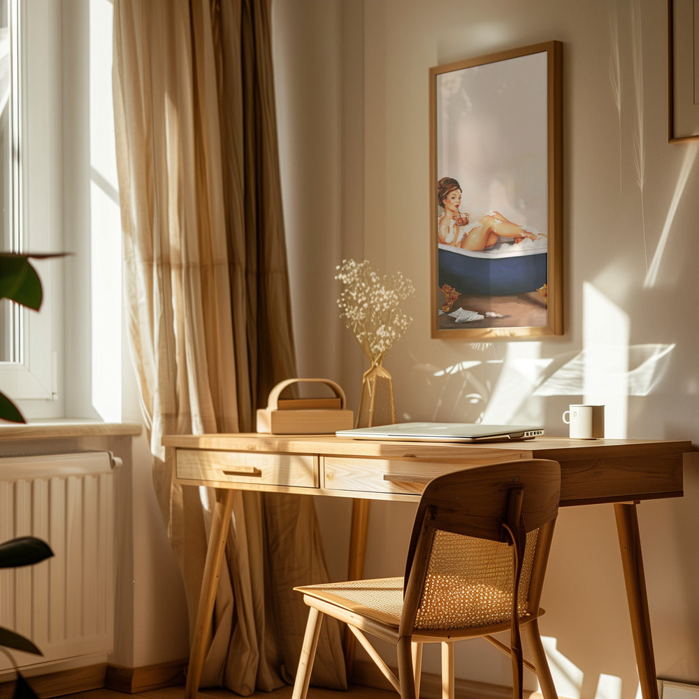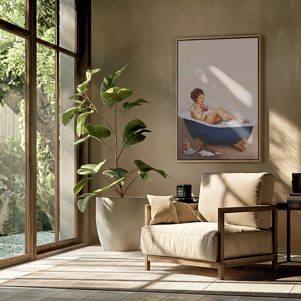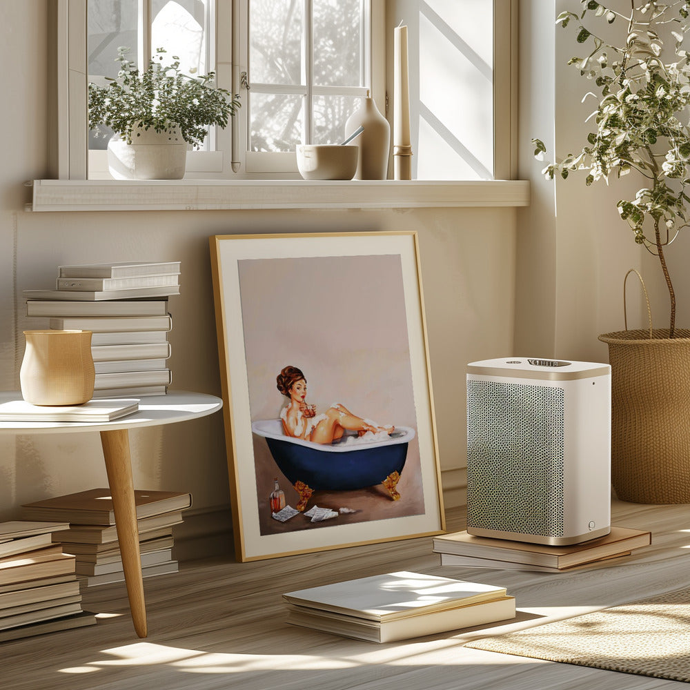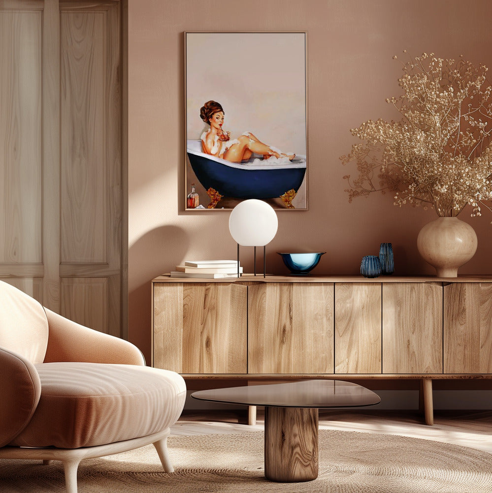 Bathtub Drinks: Pinup Girl Drinking In Bathroom Poster - 30x40 cm / 12x16″