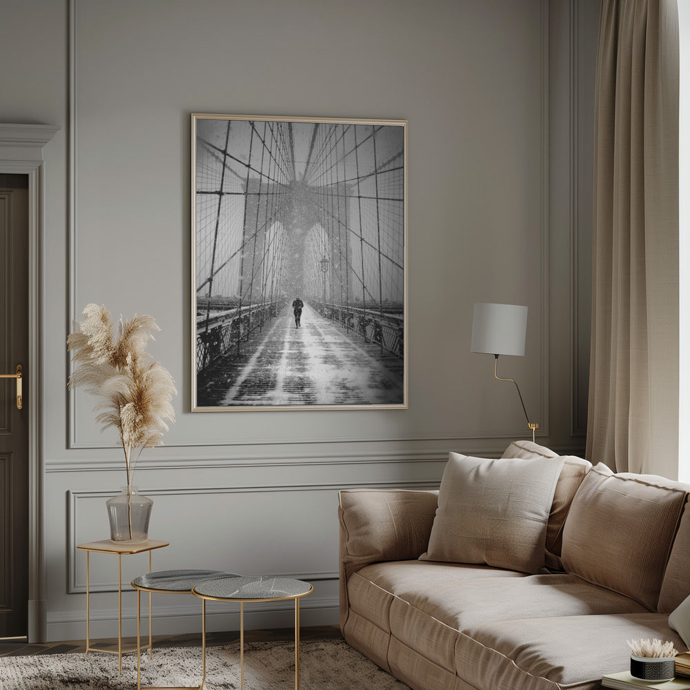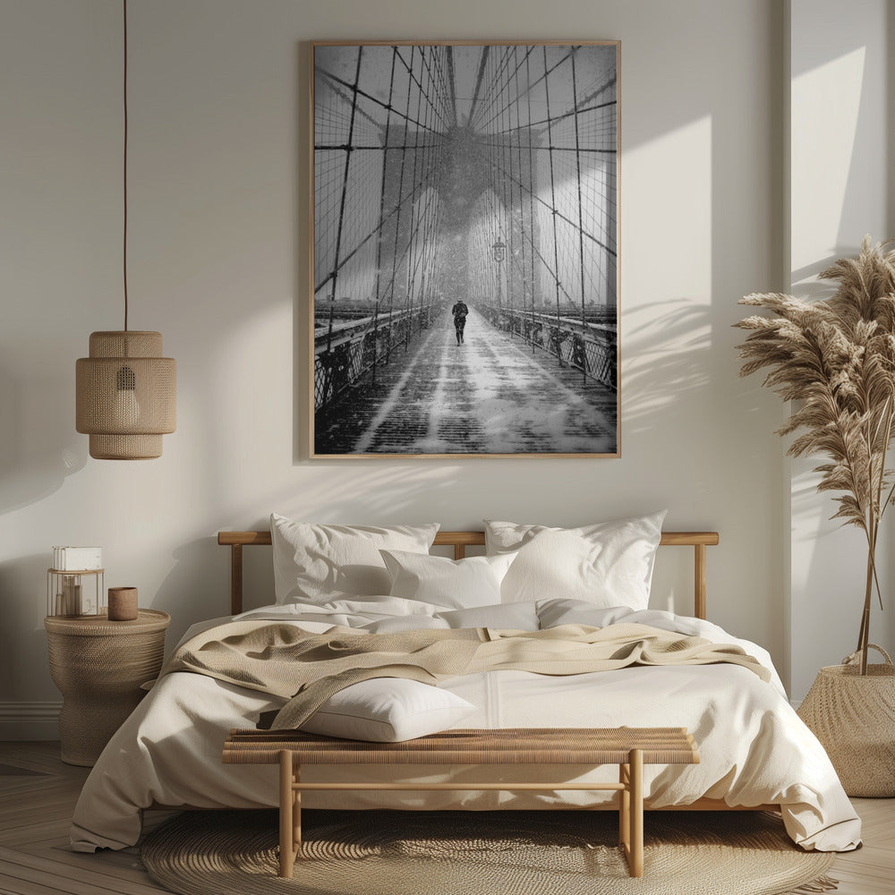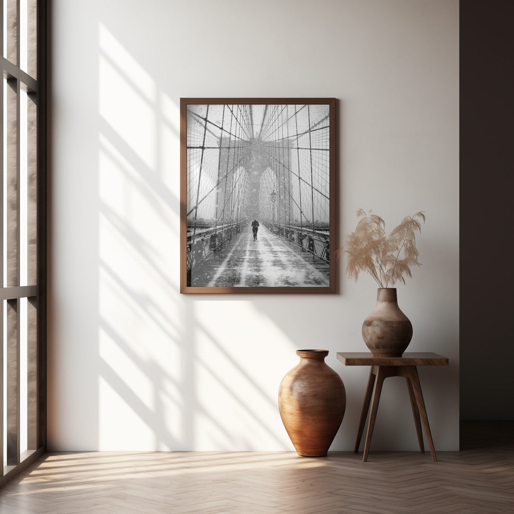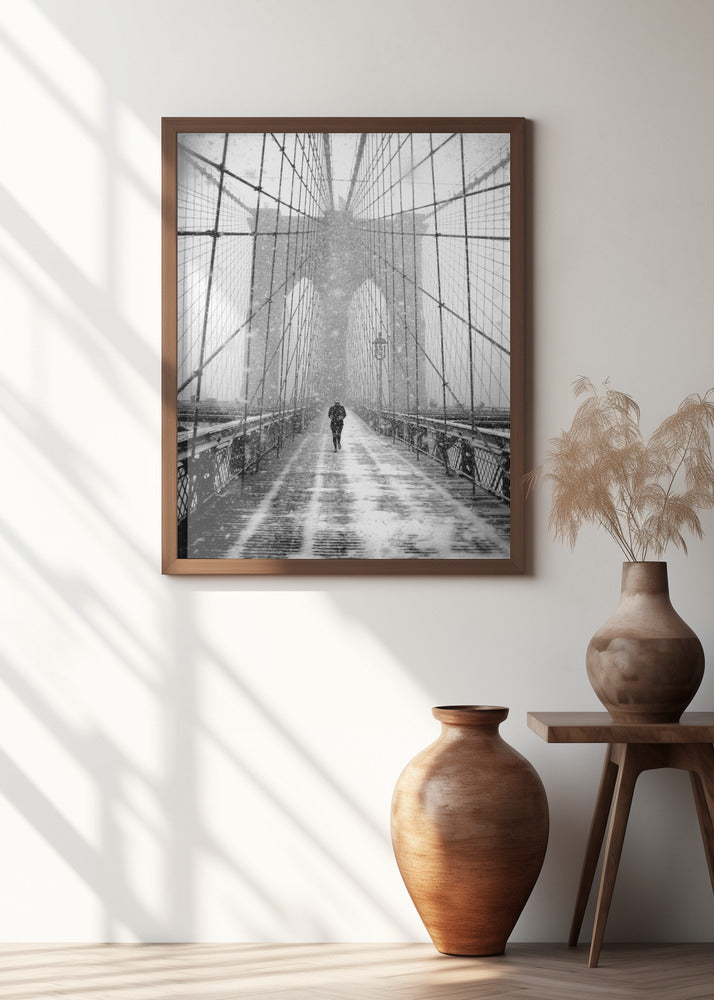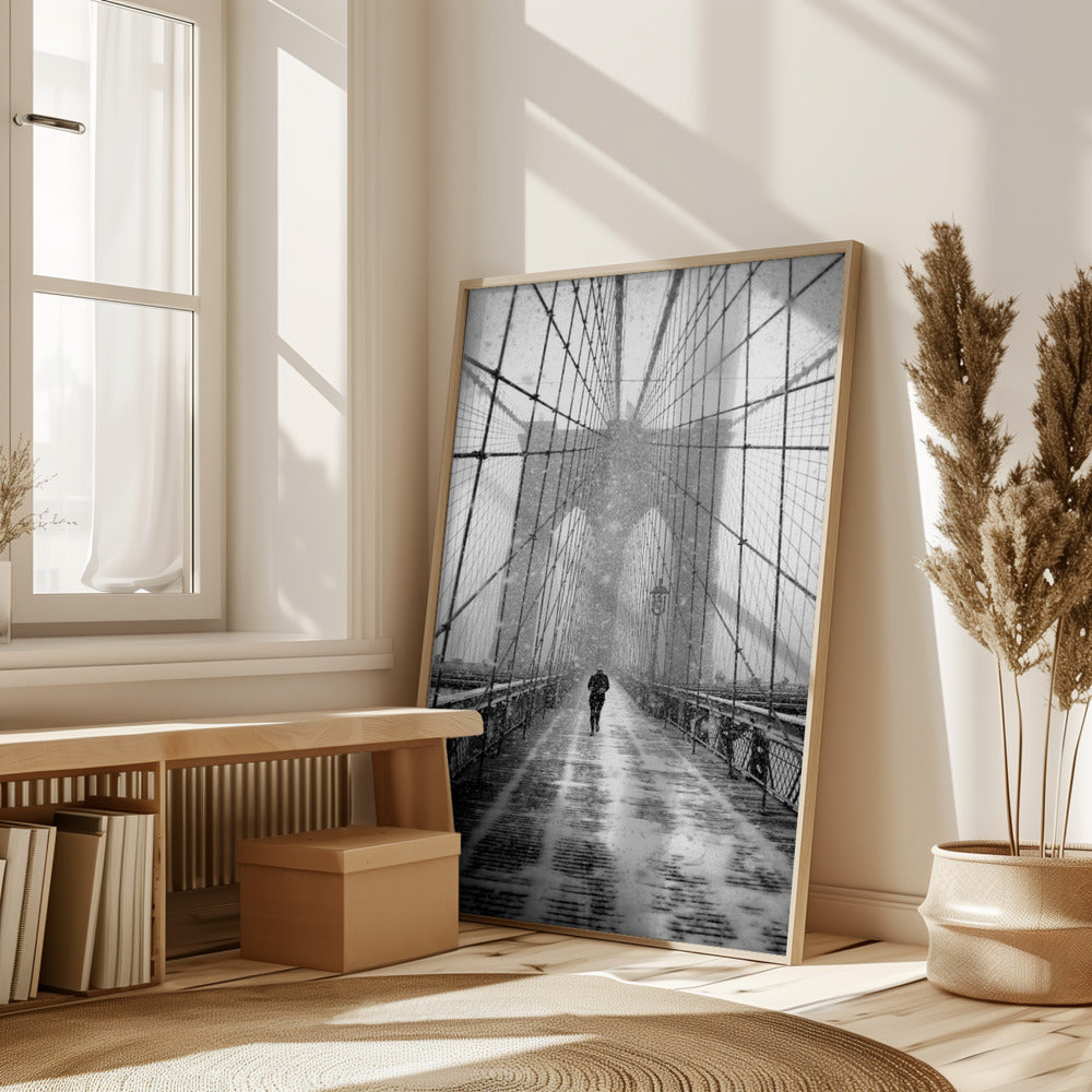 New York Walker in Blizzard - Brooklyn Bridge Poster - 30x40 cm / 12x16″
