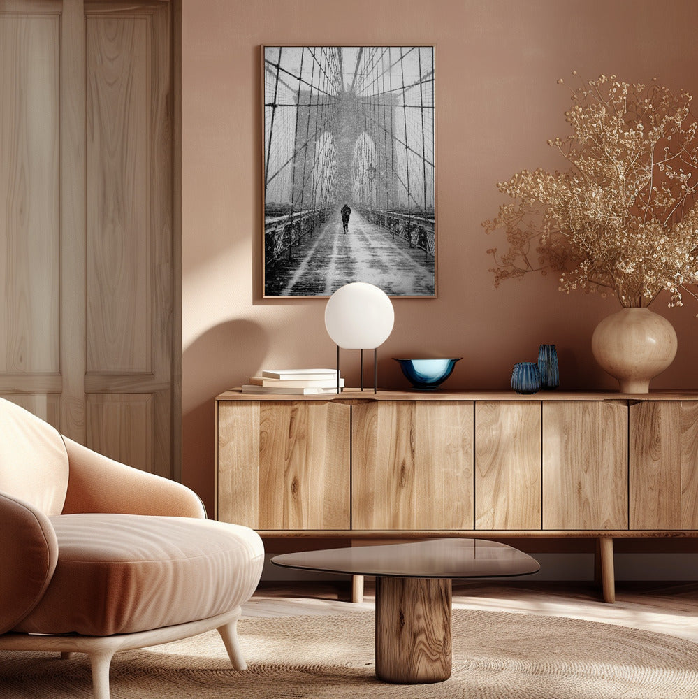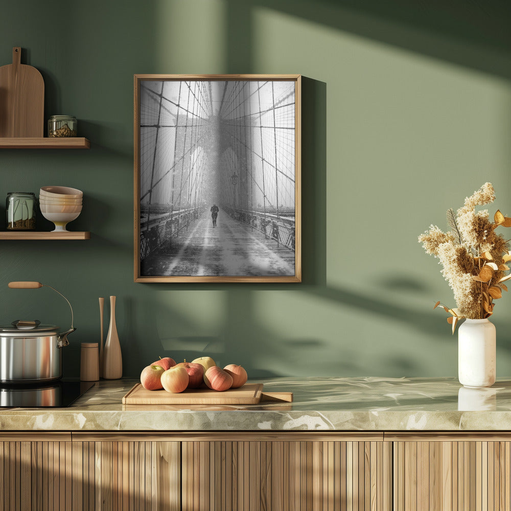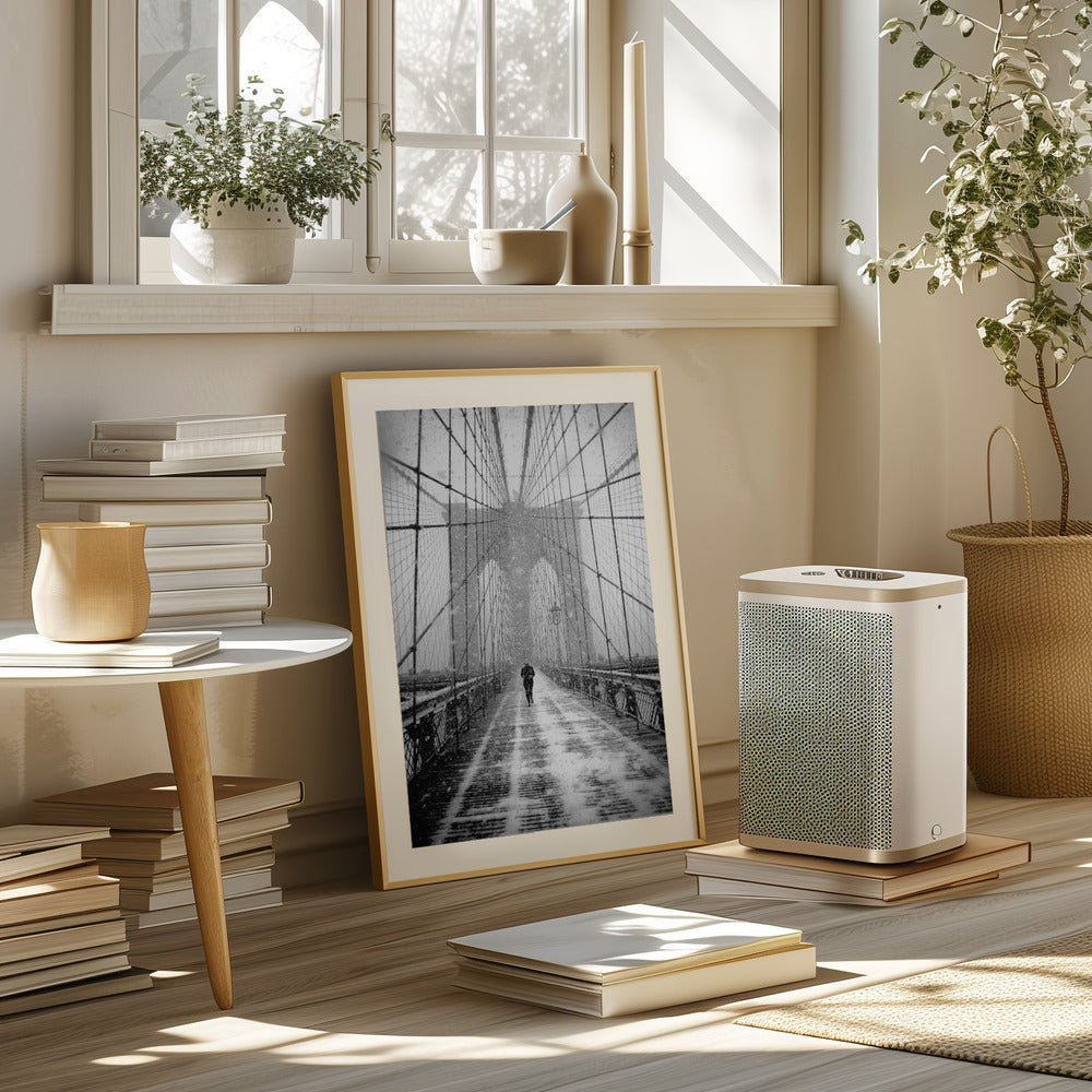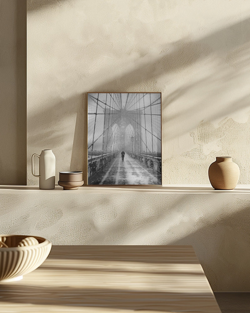 New York Walker in Blizzard - Brooklyn Bridge Poster - 30x40 cm / 12x16″